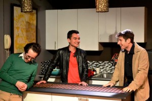 Elyanow gives no reason for the encroaching reality in these characters’ lives. But soon they are miserable and the play stumbles on interminably. TV sitcom director Rick Shaw’s comedy timing is lacking here and his eager cast just can’t breathe much life into these stick figures. Julie Dolan as Chloe, the voice of reason, and AJ Brody as Raymond/Ramona fare best among the disparate cast. Jordan Wall’s character of Mark is not very funny in the sitcom scenes and although he protests most about the fun-sucking reality, he’s the one to talk about the towers coming down on 9/11. Mark also has one of the strangest bits of business. When he decides a boxer short wearing Billy needs to get dressed and out of the apartment, he goes into the living room closet, brings out a duffel bag and proceeds to give Billy his clothes. Billy is one of the apartment’s residents with a bedroom of his own. Are there no dramaturges left in theatre?