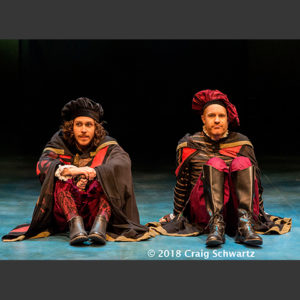 Rosencrantz (Kasey Mafaffy) and Guildenstern (Rafael Goldstein) are having a philosophical dialogue on the meaning of their lives, not remembering what came before this moment or what is to come later. They have engaged in a game of coin tossing that has resulted in over 90 consecutive tosses all ending up as “heads.” Is that even possible or plausible? The twosome doesn’t know but they keep tossing the coins. Finally they hear the sound of music and a troupe of woeful looking tragedians appear on the road, bound for nearby Elsinore where R&G finally realize they have been summoned by King Claudius.