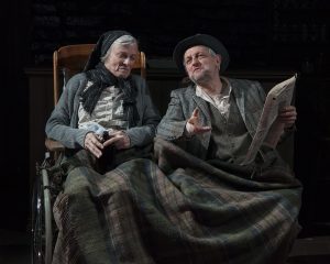Billy (Matthew Grondin) is a teenager whose left arm and leg have been crippled since birth. He was raised by two spinster sister/shopkeepers on the small island of Inishmaan off the West Coast of Ireland. He has grown up with the story of his parents drowning while attempting to leave for America and a better life for themselves and their newborn son. He was told their life insurance paid for his much needed surgery to keep him alive at the time. There are a lot of tall tales spun among this close knit community of islanders, all of them crippled in less visible ways. Gossip is the meat of their lives and JohnnyPateenMike (JD Cullum) is the gossip monger extraordinaire. He is always keen to eavesdrop on his neighbors, pencil and notebook at the ready. He trades his “news” for more edible items. JohnnyPateenMike is saddled with his 90 year old drunkard of a Mammy (Anne Gee Byrd), who has been trying to kill herself with alcohol for over 60 years since the loss of her beloved husband. Her son has been aiding her for the past 20 years to no avail so far. Cullum and Byrd make a great comic duo; their timing is precise and the laughs they generate are deep and heartfelt. They would have made a great music hall act in 1934 London if they could ever get off their little island.