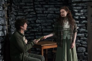 Irish writer Martin McDonagh is now a well-known and well-respected screenwriter and film director after 2017’s Three Billboards Outside Ebbing, Missouri as well as his earlier films In Bruges and Seven Psychopaths. He first came to acclaim with The Leenane Trilogy of plays—The Beauty Queen of Leenane, A Skull in Connemara and The Lonesome West. He has an uncanny talent for mixing dark humor with shocking violence, causing his audiences to laugh and gasp, often at the same time. Antaeus Theatre Company is currently presenting The Cripple of Inishmaan which may be McDonagh’s funniest and probably his least violent stage work. John Iacovelli’s gorgeous natural stone looking scenic design at worst gets an egging but the stage is not drenched in blood as it is in McDonagh’s The Lieutenant of Inishmore.