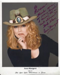 Here’s the lovelier than lovely Ann-Margret. Every time she’d fret about something when we were recording Best Little Whorehouse, I’d say, “Ann-Margret, it’s only a cast album” and she’d laugh and on we’d go. That’s what she’s referencing in what she wrote.