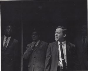 Another show I loved that I got to do was How to Succeed in Business Without Really Trying. I played Finch. Here I am, just starting to sing the title song after having been lowered from the flies on a window washing thing – I hate heights and they would have to fly me up there five minutes before curtain.