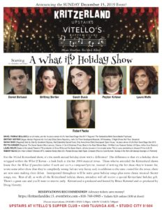 Today, I can sleep until ten or eleven, then I’ll do the usual morning things, get the Facebook event page up for the December 15 Kritzerland holiday show, do some work at the piano and on the computer, eat, hopefully pick up some packages, and then we have our rehearsal. Tonight, we’ll do for act two what we did for act one, but I really want to run this act twice. Hopefully, there won’t be too much blocking to adjust. Here’s the flyer for the Kritzerland show.
