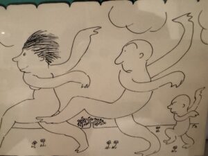 To kill time, once again I walked down to Wallichs and since I was still intrigued by the title of the show I’d just read about, The Unsinkable Molly Brown, I found that cast album and took it into the listening booth and played it, fell in love with, and bought it. And that Tammy Grimes and that voice – irresistible. I had my Dodger burger, then went back to the theater, got my program, read it front to back, noted that every seat in the theater was taken, and then the house lights dimmed as music began, coming live from the stage. The curtain rose on what I later learned was called a scrim, and on the scrim was a classic Thurber drawing of a man, woman, and child. I can’t tell you why, but that drawing got a huge laugh and I believe it was because of the expression on the child’s face, and no one was laughing louder than I. It’s still one of my favorite Thurber drawings. Oh, and I’d already done my due diligence, Thurber-wise, at Pickwick Books, by thumbing through a couple of his books and loving his drawings and cartoons. Through the scrim you could see four musicians on stage, playing live – wonderful, jazzy music. I knew I’d need to have the album if there was one. Here’s that drawing that was on the scrim. It still makes me laugh out loud.