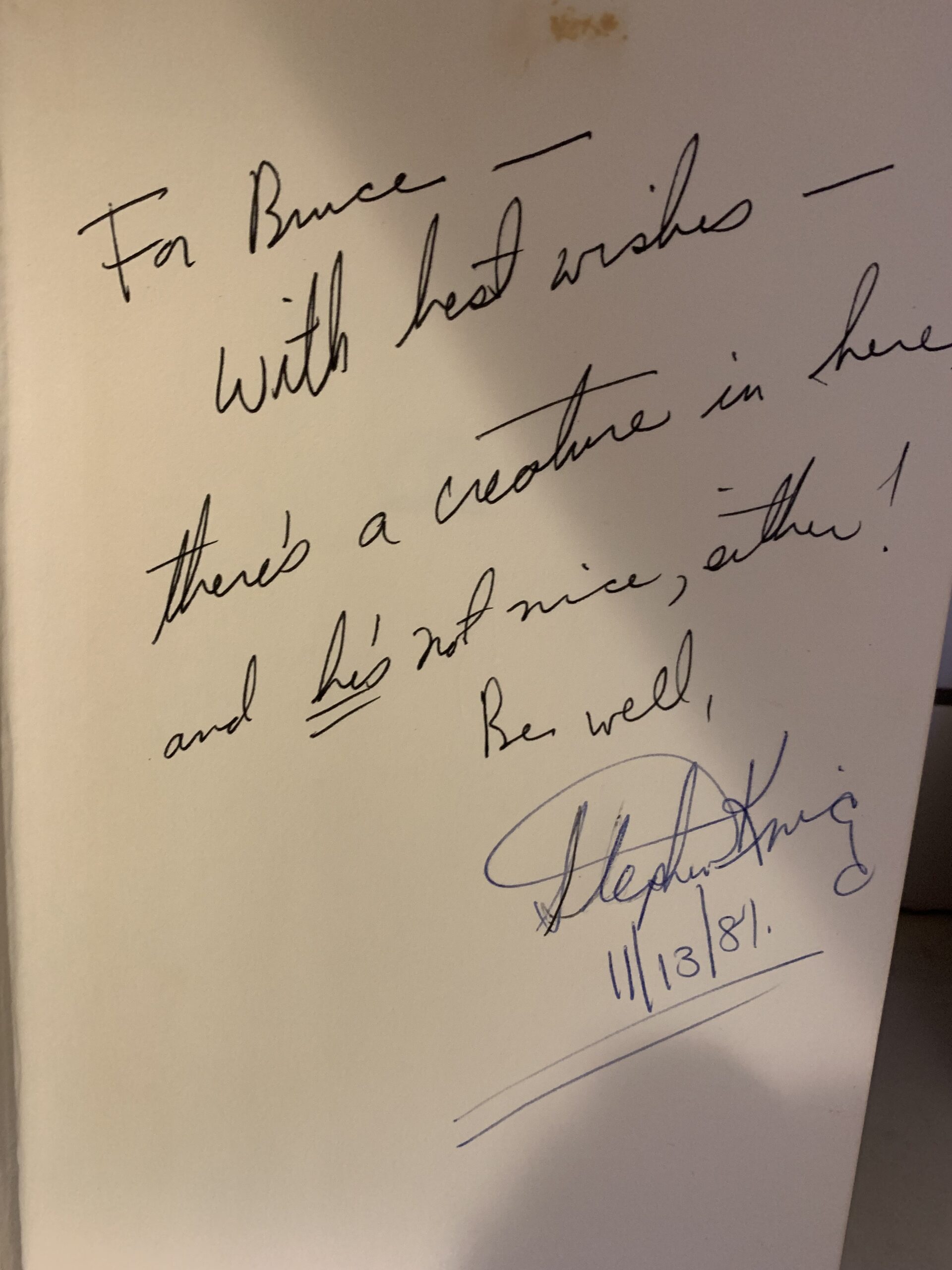 Anyway, I loved the novel of The Shining and got myself a nice first edition of it, along with a nice first edition of The Stand, which I then read. I loved the first half of The Stand, but not the second. But it was his next novel that made me a huge fan – The Dead Zone. What a book that was and happily the film of it was just as good. Then came one great book after another with Firestarter, Cujo, and Christine. I not only had first editions of all those, I had the signed limited editions, too. Cujo came out the year we shot The Creature Wasn’t Nice. The wife of one of the producers was friends with Stephen King and presented me with a signed copy of the book, with the inscription, “There’s a creature in here and he’s not nice either!”
