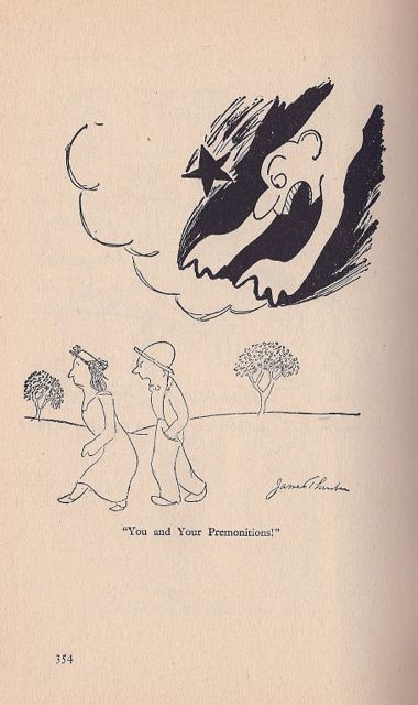 I went through my iPhotos to see if there were any fun photographs I wanted to post in these here notes, and I did export a few for the next few days. One photograph I’ll post now is a classic James Thurber New Yorker cartoon. I have been a fan of Mr. Thurber ever since I saw A Thurber Carnival at the Huntington Hartford Theater, the national tour of the show with Imogene Coca, King Donovan, and Arthur Treacher. I thought it was the wittiest, cleverest, funniest thing ever and even went back to see it a second time. Of course, I then had to seek out all Mr. Thurber’s books and cartoons, and I just adored them, especially the cartoons. Thurber was a one-off with a completely original sense of humor and way of looking at things, and his line art is so simple and so brilliant, as are his captions. You know how you know someone is funny? When the show curtain, a Thurber drawing, gets a laugh as soon as the theater curtain rose to reveal it. I felt such a kinship with Mr. Thurber and was certainly influenced by him. So imagine my surprise to find out that we were both born on December 8. Anyway, this cartoon is amongst my favorites of all of his. It first appeared in the New Yorker in 1938.