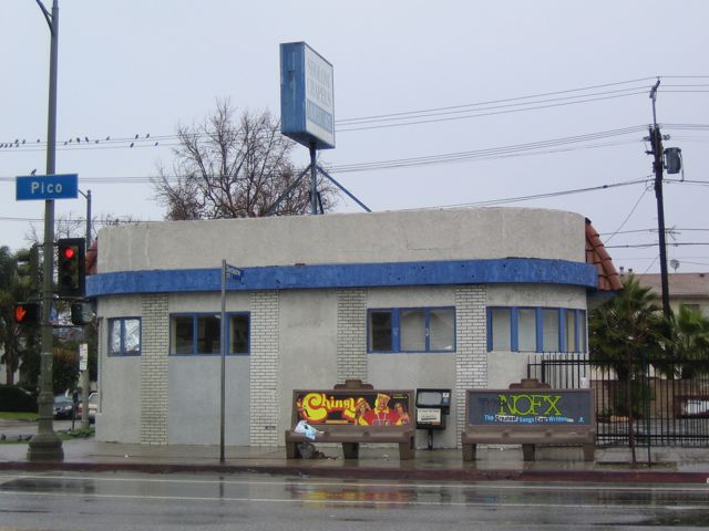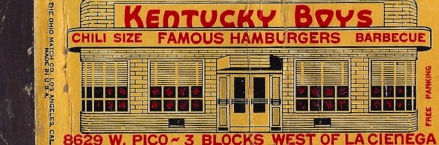 Anyone who’s read the first Kritzer book knows of my enduring love for Kentucky Boys hamburgers, the first hamburger I ever remember eating. I can taste it now, that’s how strong the memory of it is. I went there so often – alone, with my brother. The building sat on the northeast corner of Pico and Sherbourne – we lived just three blocks down from there on Sherbourne, so it was just a quick walk. It was a classic diner building and it’s still there exactly as it was, only now it’s a mortuary! Can you believe it? Finding anything related to Kentucky Boys has been nigh unto impossible, but I finally found a matchbook on eBay, so you can kind of see what the building looked like. At an antiques show here in LA about seven years ago I walked into a dealer booth that had some art, just to look around and do you know what I found there? The original architect’s rendering of Kentucky Boys. The dealer had no idea what it was. What are the chances? What are the odds? I snapped it up, of course, and it’s framed and hanging in my house. Here is the matchbook cover, followed by a photo of how it looks today as a mortuary. All you have to do is imagine the front doors and the Kentucky Boys sign.