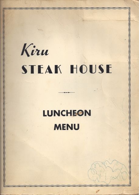 Well, dear readers, the response to yesterday’s visual essay was so overwhelming – not merely whelming, mind you, but OVERwhelming – that I thought we’d do more of the same today and hopefully I’ll have time to get all these scans cropped in time to get the notes posted by midnight. In other words, I will be burning the midnight oil and then I will have burnt oil – what I’ll do with the burnt oil is anyone’s guess. So, for today, I have scanned lots of menus of eateries that I frequented as a young sprig of a twig of a tad of a lad of a youth – from my boyhood to my teen hood, not necessarily in that order. So, we begin our restaurant journey with my father’s – dear reader Jane asked if I had anything else related to my father’s restaurant, the Kiru. I do have a wonderful ashtray but there’s no way to scan an ashtray. So, instead I have scanned this lunch menu – I have been unsuccessful so far in tracking down a Kiru menu that looked like what I remember the menu looking like. This one is a lunch menu and probably dates from the late 1950s, at least that’s what the prices would indicate. I can’t imagine it would be later than that, although some of the sandwiches are more money than many other restaurants were charging in the late 1950s – so, a bit of a mystery. But here’s the cover of the menu.
