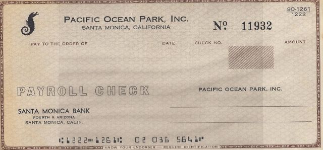 And finally, not restaurant related, this wacky and weird find – I’m probably the only person on the planet who has one of these: It’s a blank, unused payroll check from Pacific Ocean Park. Can you believe it?