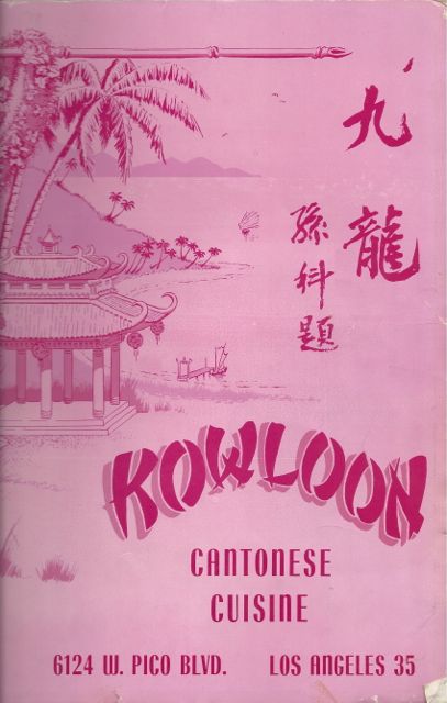 But our favorite was Kowloon, which was on Pico west of La Cienega, near Shenandoah. Kowloon was beloved by all, and we frequently saw movie people there – the one I remember vividly because he was just so handsome and suave was Cesar Romero. Here’s the front of their menu. Our favorites there were the appetizers of fried shrimp, pork, and spare ribs. The chow mein was also yummilicious.