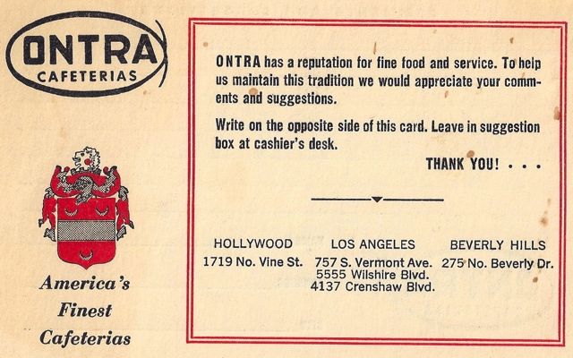 Yesterday, I posted the photo of Ontra Cafeteria. Here is the little comments card you could fill out – there are three locations mentioned and I ate regularly at each. Cindy Williams and I used to gorge ourselves silly at the Hollywood location, which was just north of Hollywood Blvd. on Vine on the west side of the street.