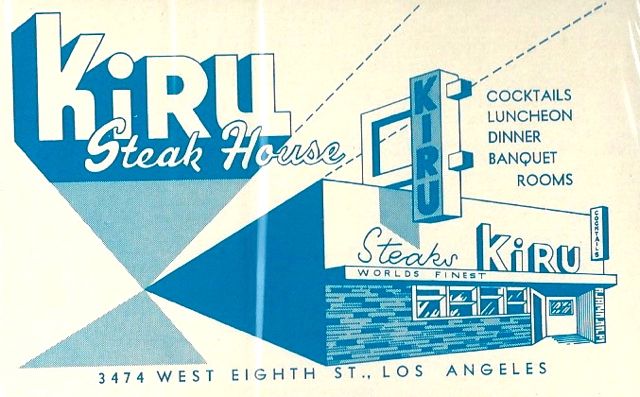Plain, you see. The menu I remember had a drawing of the front of the building on it and was pinkish in color. Here’s a page from the inside of the menu. The steak sandwich was one of the most popular dishes at the Kiru. I don’t know of any place in LA today, outside of maybe the Smoke House, where they serve a steak sandwich.