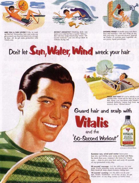 I then went and had a grilled cheese and bacon sandwich and no fries or onion rings, then returned tapes to the MGM vaults, then picked up no packages, then came home. I had some listening to do, which I did. I then played the Sandy CD sequence for the sixth time and I’m very happy with it, which means I got it right on the first try – which is kind of a rare occasion. Then Mr. Piano Tuner came and tuned the piano, which is a good thing for a piano tuner to do. He did a fine job and now the piano is perfectly in tune for next week’s rehearsal. And now, a word from our sponsor – Vitalis, with V-7, the greaseless grooming discovery. I was fascinated by the hair products of the 1950s. I never used any of them but I made my mother buy them so I could smell them and pour them in the sink. My brother, on the other hand, was all about pomade and other hair products that would grease up his hair. I was the natural type – what my hair did my hair did. I liked all the commercials, though – “a little dab’ll do ya” and all that stuff. But Vitalis with V-7, that was the best because it had V-7 – that sounded very interesting to my child brain, very mysterious. Here is a little ad for Vitalis with V-7.