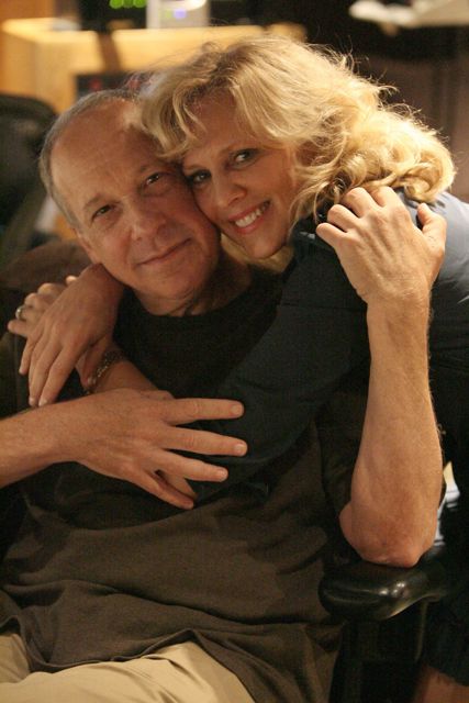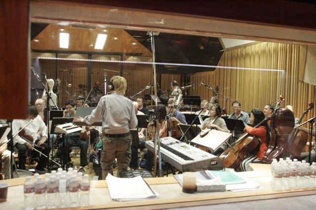 Well, dear readers, this week has flown by, like a gazelle recounting the story of The Randy Vicar and the Button Hook. I feel there’s been a dearth of Randy Vicar stories here at haineshisway.com, don’t you? In any case, it’s Friday already and already it’s Friday. I feel Friday should be photograph day or, to keep it alliterative, fotograph day. I have some photographs to share and share them I shall. These were taken at the Sandy Bainum recording sessions by photographer Michael Lamont (who is the ever-lovin’ of Kay Cole). First we have a view of our thirty-four piece orchestra – obviously it’s hard to see the drummer, who’s way in the back, and the bass player, who’s behind a baffle (same with the guitar player), and the harp player, who’s just out of sight over on the right. But it will give you an idea and that’s Lanny Meyers at the podium.