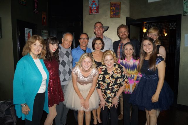 Well, dear readers, Kritzerland at Sterling’s 37, our three-year anniversary show is done and I’m still riding high on our two show day. I can’t say that doing the show twice was easy (at least for me), but both our matinee audience and our evening audience were so much fun and thankfully I got my second wind just before the evening show began. The afternoon show was really fun, mostly because about eighty percent of the people there were seeing their first Kritzerland show. The show went very smoothly – a handful of flubbed lyrics, but everyone covered and behaved professionally and the audience was with them every step of the way. The first show had lots of laughs, although some stuff worked better in the second show in terms of patter because the first audience didn’t really know the various running gags we do. Lots of honest cheers in both shows – not the annoying woo-hooing that I loathe so much, but honest, deserved response. The cast was very consistent in both shows in terms of landing the material. And what a cast it was – Dan Callaway, Kay Cole, Joshua Finkel, Jane Noseworthy and Valerie Perri, along with Jenna Lea Rosen, Sami Staitman and Sarah Staitman, and our guest star Sharon McNight. All brilliantly accompanied by John Boswell. Here we all are backstage just before the evening show.