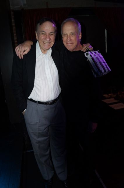 The second show, while not flub-free, was equally as good, with big laughs, great ovations for the songs, and just a wonderfully receptive audience, packed to the rafters. The Hadley bit went even better in the evening show. And Richard Sherman doing The Chimpanzoo (for which he’d written a brand new verse just before coming to the club) was priceless. All in all, I could not have been happier. We had wonderful people in attendance for both shows – at the evening show we had Patricia Ward Kelly, who was married to someone named Gene Kelly, and we had a whole slew of Disney people there. Sandy Bainum and Lanny Meyers were with us, too, and our very own VinTek, and Tom Hatten, who’s become a bit of a regular, was also there. At the matinee, it was lovely to have our very own Mr. Nick Redman and his ever-lovin’ Julie Kirgo with us. And at both shows we had our wonderful dear reader KevinH, who’d flown in especially for the shows. Here are some photographs. First up is me and Richard Sherman.