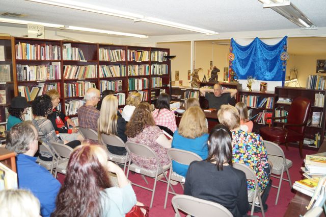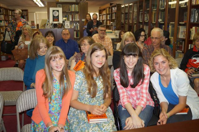 Well, dear readers, the book signing was way too much fun.  Yes, you heard it here, dear readers, the book signing was way too much fun, which means, in plain English, it was way too much FUN.  First of all, I had more folks there than we’ve ever had, a little over thirty in total.  And fun folks they were or, in plain English, what FUN folks they were.  I had our wonderful youngsters in the first row – left to right they’re Brennley Brown, Oliviana Marie, Jenna Lea Rosen and Sami Staitman.  Here’s a photo to prove it – in this photo you can also see our very own Adryan Russ, Doug Haverty lurking in the background, neighbor Tony Slide and cousin Dee Dee sitting in the back row to the right, way over in the corner in the second row on the right is Lanny Meyers, and hidden behind Jenna is Muse Margaret and her ever-lovin’ Richard.  In the blue shirt in the back is the new haineshisway.com reviewer, Rob Stevens and somewhere Nick Redman is checking his phone.  This was taken while the place was still filling up.