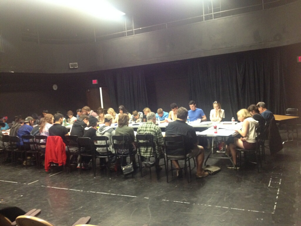 Act two is a lot shorter than act one, so that’s a good thing. I do have to figure out some transition things, but mostly I think this will all fall into place. It is my goal to be finished, at least in rough form, blocking the show by the end of next week – it IS a huge show, though. But I was so pleased with our first day and will look forward to getting this show up on its feet. Here is an actual photograph of our mighty cast at the table reading.
