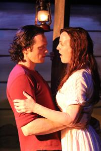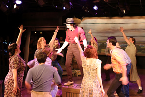 The show’s best asset is the strong book by N. Richard Nash who wrote the original play as well as the screenplay for the beloved 1956 film that starred Burt Lancaster and Katharine Hepburn. His characters and their actions are well established and the cast played them adeptly. The singing voices are not that strong, and are often drowned out by the five-piece onstage band led by Musical Director Bryan Blaskie, but they delivered the emotions and subtext. The strongest voice belongs to Treva Tegtmeier as Lizzie, the unmarried woman who has become a worrisome problem for her aging father and two brothers. She can easily assay her way through the comedy of “Raunchy” as well as the anger of “Old Maid,” but it is in the joyful realization of her own beauty in “Is It Really Me?” that she dazzles. Skylar Adams makes a very charismatic con man as Starbuck, the man who promises to bring rain to the drought-stricken town for $100.00. He doesn’t have a strong voice but his passion brings religious revival tent fervor to “The Rain Song.” Adams also brings a lonely soulfulness to “Evenin’ Star,” a tune added to the 2007 revival and heard here. Lizzie and Starbuck have real lightning rod worthy chemistry in their scenes together thanks to the talents of this dynamic duo. Richard Israel’s tight direction keeps the show moving swiftly, coming in at just over two hours with intermission. He keeps his cast artfully positioned on the tiny thrust stage. And he makes it rain on the cast for the uplifting finale and that counts as a true theatrical miracle.
