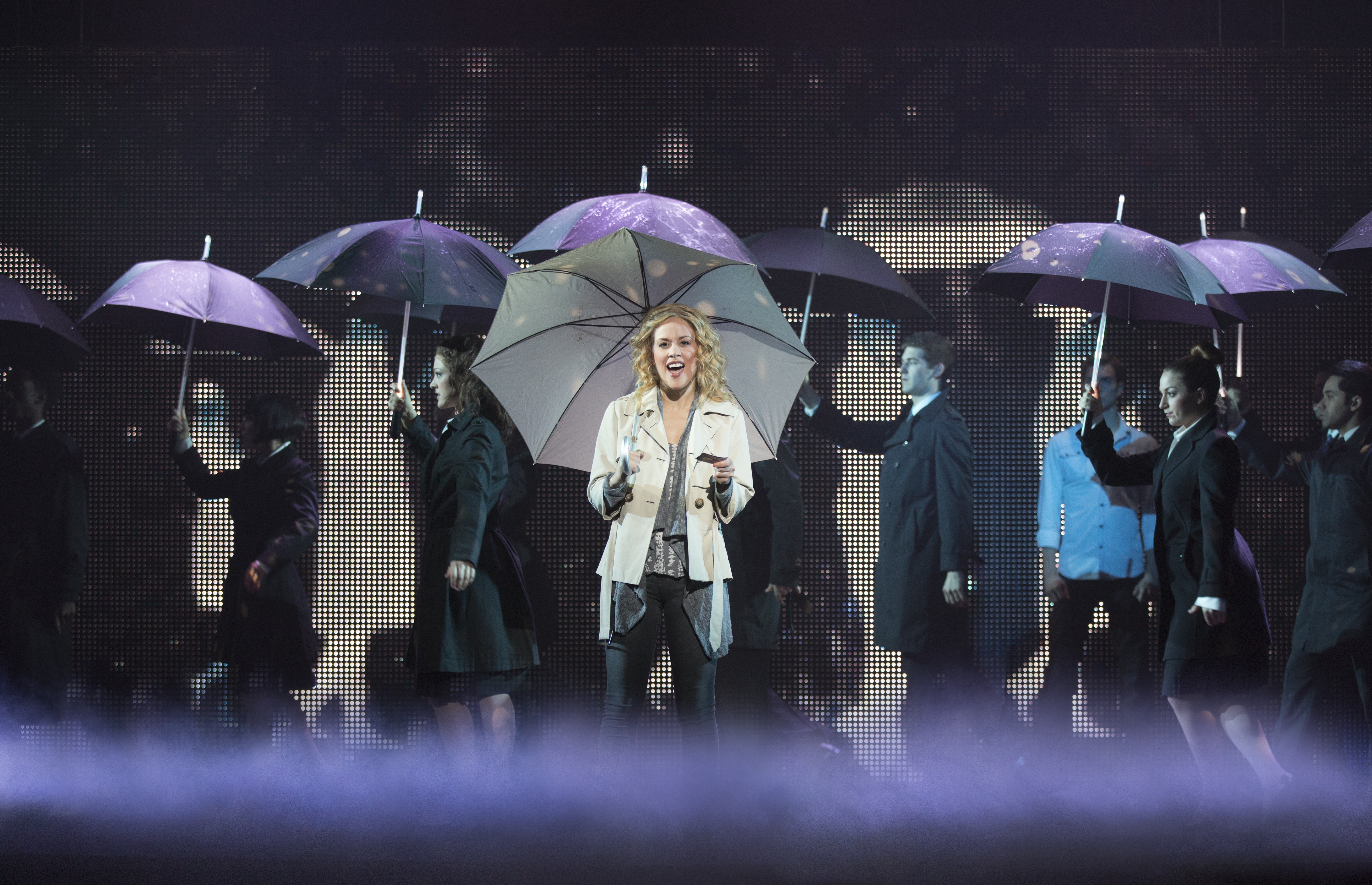 Hugh Vanstone’s lighting design (recreated by Joel Shier) either blinds the audience or else keeps the action in the shadows so you can’t see how the illusions by Paul Kieve are achieved. At times the illusions are fun to watch but they aren’t consistent. At times we can see Sam walk through walls, move objects etc with the help of the special effects but there are a few times when only his voice is heard while the effects are happening. And what is it with the fog machine? There is ground fog when Sam & Molly move into their new apartment and later in Sam’s office. It’s not a ghostly effect because Sam is still alive at that point. Jon Driscoll’s video and projection design is very impressive for a stage show, but if you are going to watch a video you would be better off with the original film.