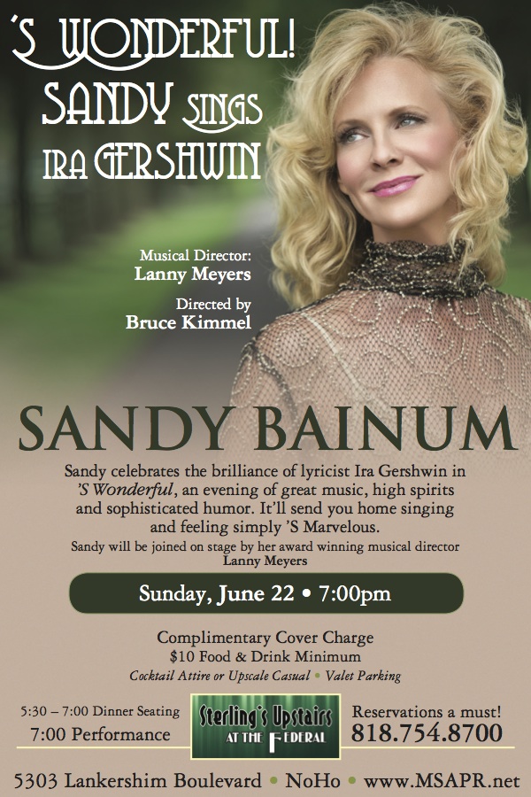 Last night, I watched a motion picture made for television somewhere in the world, but I can’t really talk about it since it could end up as an upcoming project for Kritzerland.  And then I watched We Steal Secrets, which was quite long for a documentary, like two hours.  After that, I just relaxed and played on the computer.  Oh, and I also did the event page for Sandy Bainum’s upcoming Ira Gershwin show.  Here’s the card for it.
