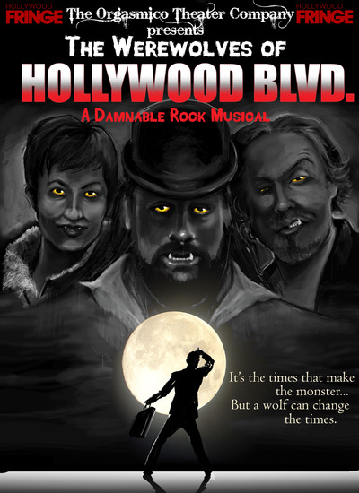 Bloodsuckers rule in Hollywood and werewolves have been pushed to the back of the pack. They are even behind the zombies. An ex mental patient/writer hopes to remedy that situation when he personally delivers a script for a proposed werewolf trilogy to a high powered Hollywood agent. So begins Michael Shaw Fisher’s The Werewolves of Hollywood Blvd.—A Damnable Rock Musical. It is being presented by Orgasmico Theatre Co. as part of the Hollywood Fringe Festival. Michael Teoli provides the music, arrangements and additional lyrics while also serving as Musical Director. The result is a really enjoyable rock and roll tale of horror with a comic twist.