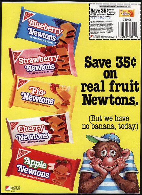 Well, dear readers, this week is flying by, like a gazelle eating a Fig Newton. Does anyone still eat a Fig Newton? I do believe they are not quite as popular as they once were and why is that, do you think? Once upon a time the Fig Newton was VERY popular with the populace. Now it is passed over in favor of other cookies. The Fig Newton is starting to get a complex, frankly. The Fig Newton is feeling unloved. I think it’s time for a Fig Newton comeback, don’t you? Did you know the Fig Newton was first made in 1891? Legend has it that the inventor of the Fig Newton, Newton G. Plank had invented a way of putting fig paste into a pastry. His girlfriend at the time, Henrietta Flump was bored and said, “You know, I don’t give a fig, Newton” and the rest is history. But according to Wikipedia, it was, in fact, Charles Roser, a Philadelphia baker and fig lover who invented it. The Newton came from the small town, Newton, Massachusetts. Don’t we feel that Massachusetts has a few too many letters in it? I always liked Fig Newtons from as far back as I can remember. You could eat them slowly and make them last, they were chewy on the inside but flaky on the outside, rather like I am now, but the biggest problem I had with the Fig Newton was that I could not stop eating them until I’d finished an entire package. There was a very brief time when Nabisco introduced the Cherry Newton and oh did I love that, but apparently I was the only one and it didn’t last more than a few months, back in the late 1980s, I think. Well, lookie what I found. An ad for various Newtons, including my beloved Cherry. 1987 the ad is from, but I think it may be earlier than that, like the first part of the 80s. I even found a Facebook page called Bring Back the Cherry Newton. I think we need a campaign here. Let’s rally the haineshisway.com forces, shall we? Damn the torpedoes, full speed ahead, baby. What the HELL am I talking about? Well, this:
