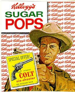 Well, dear readers, I do believe it is sort of raining outside. Not hard, but supposedly we’re going to have some hard rains in the middle of the night. We shall see. The weather report has been brought to you by Kellogg’s Sugar Pops, the favorite cereal of Wild Bill Hickock on the television. “Sugar Pops are tops” in case you didn’t know. Does anyone still eat Sugar Pops? Do they even make such a cereal now or has Kellogg’s killed it off, in which case they would be a cereal killer? Well, I’ll be swacked and pickled in moonshine – they still make the cereal but it’s now called Corn Pops. Is that how we’ve devolved? Sugar is a bad word now? I hate to say it, but Corn Pops sounds unappealing, like corn on the cob lollipops or something. Damn them, damn them all to hell. What is so wrong about Sugar Pops? It was good enough for kids of all ages for decades and it’s probably exactly the same, but now they have to pander to today’s silly parents? I say revolt! I say take a stand! I say bring back Sugar Pops because Sugar Pops are tops. Just look how appealing the box is – AND we even get Wild Bill Hickock as played by Guy Madison.