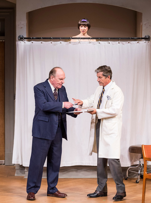 Paxton Whitehead, Sarah Manton and Charles Shaughnessy in What The Butler Saw (photo by Craig Schwarz)