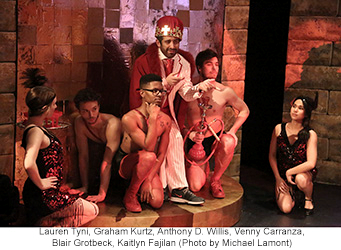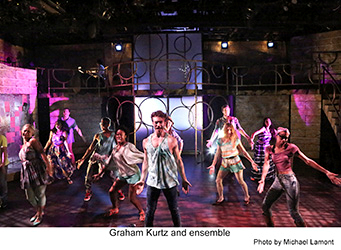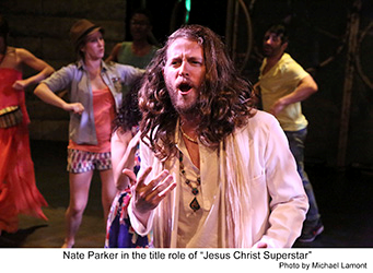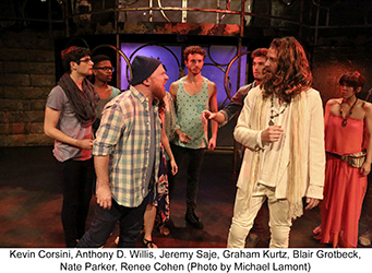 Choreographer Angela Todaro did a marvelous job with her young cast giving “Simon Zealotes” an abundance of energy. Her staging of “Superstar” features a bevy of headdress wearing Vegas showgirls. She even turns “King Herod’s Song” (perfectly inhabited by Venny Carranza) into a big tap number before it concludes. Nate Parker is a standout in the title role. His falsetto reaches unbelievable heights and he can scream to the heavens, but his soft moments are equally impressive. His “Gethsemane” is a true highlight. Renee Cohen makes a lovely Mary Magdalene and her sweet voice caresses the lyrics to “I Don’t Know How to Love Him.” Her voice blends pleasingly with that of Blair Grotbeck’s Peter in the plaintive “Could We Start Again Please?” Jeremy Saje as Judas, with his knit cap always firmly in place, looks like a longshoreman. He does a workmanlike job with the role but he really doesn’t make Judas the standout the character usually is.