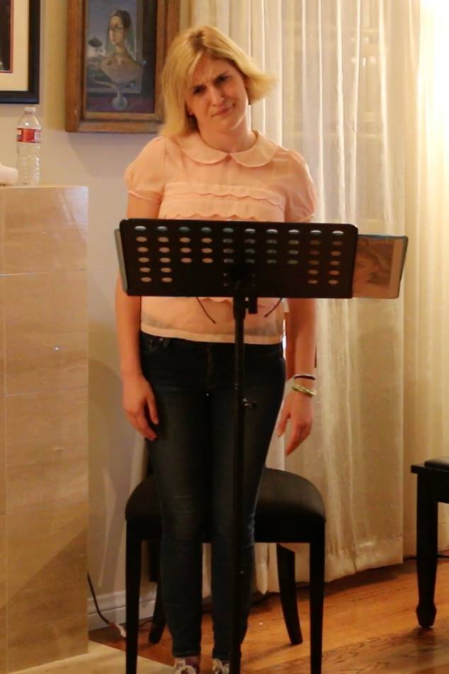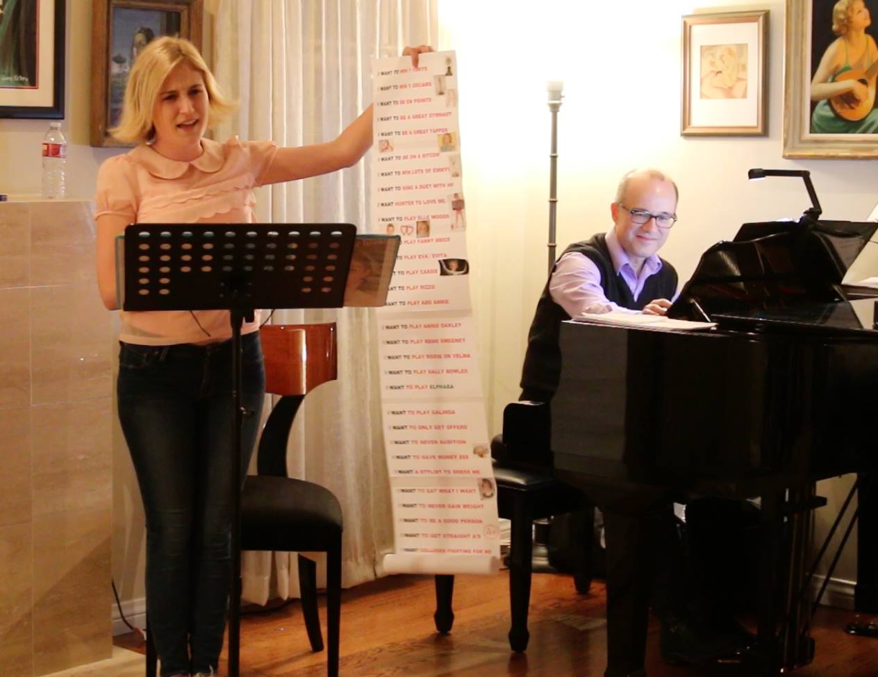 Yesterday, I slept until one in the afternoon. I didn’t really fall asleep until after three, but I guess I just needed to sleep that much. Once up, I answered e-mails, had telephonic conversations, and then Brittney Bertier, who couldn’t be with us on Monday, came to run her three songs with John Boswell. She began with Shopping Around from Wish You Were Here. Then it was A Funny Thing Happened from I Can Get It for You Wholesale, and finally Irving Berlin’s delectable You’d Be Surprised. I hadn’t realized that at some point Mr. Berlin made a lyric substitution – he changed Morris chair to easy chair. I put Morris chair right back in because my commentary is all about the use of the Morris chair in popular song. Then she left and I relaxed for a bit, then Sami and her mom came and we went to the California Pizza Kitchen. We all shared some spinach artichoke dip, which was, as always, great. I ordered a new dish – roasted garlic chicken breasts with vegetables with crispy skin. However, it did not have crispy skin and it was not very good tasting, so back it went and instead I had the jambalaya pasta, which I probably shouldn’t have had while my tummy is like this. It was very good, though. This was my fourth day without sugar for anyone who’s counting. We talked about the reading and we’re now looking forward to the workshop at the end of May. Here are some actual photographs from last Monday night’s reading.