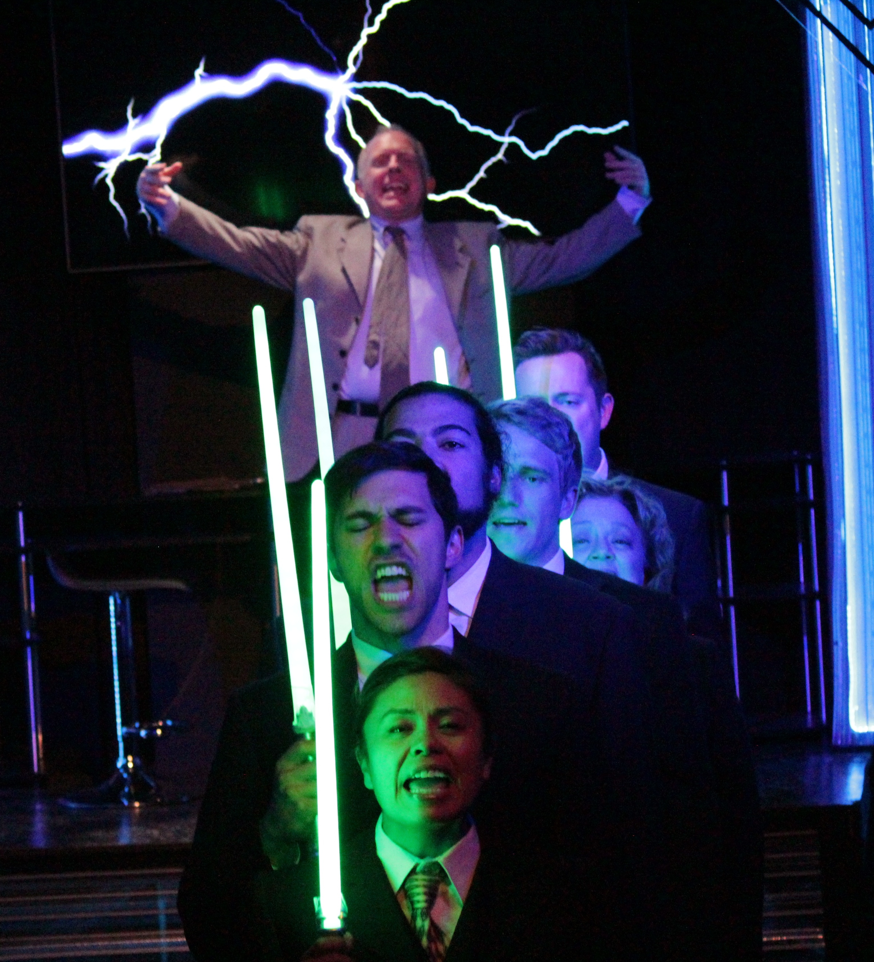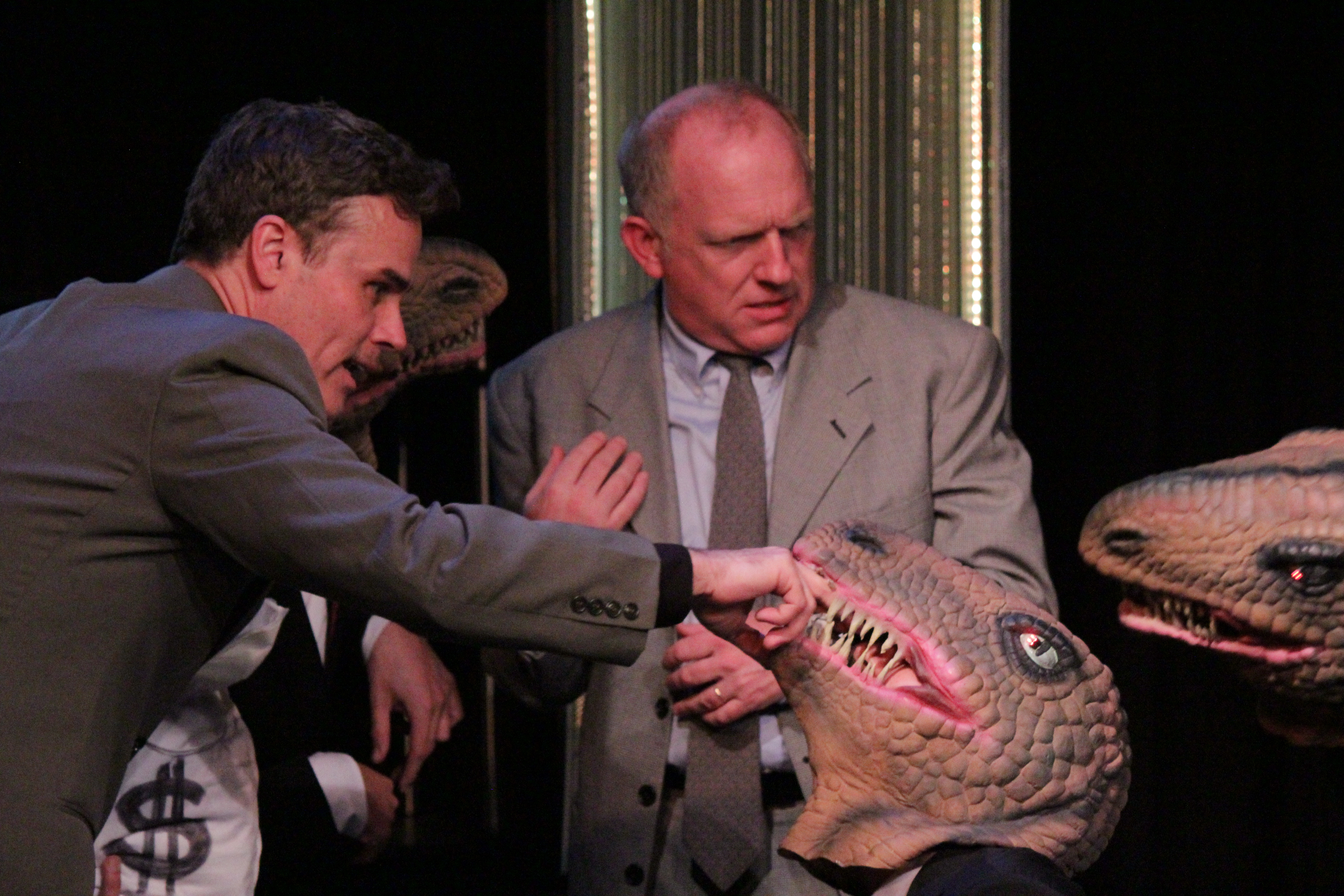 As a former accountant I know it is extremely difficult to make a balance sheet interesting to anyone, including most CEOs. Show them the money, not numbers in columns. Prebble has painstakingly outlined the financial maneuverings of Enron’s CEO Jeffrey Skilling and his duplicitous CFO Andy Fastow. But it is very dry storytelling and although she has added in “vaudeville” elements such as puppetry—the Board of Directors as Blind Mice, debt eating shadow companies as ravenous raptors—along with light saber wielding Jedi Knight energy traders, it’s a tough slog making it from beginning to end. It’s a very cold, impersonal and soulless show, just like the money grubbing characters it presents.