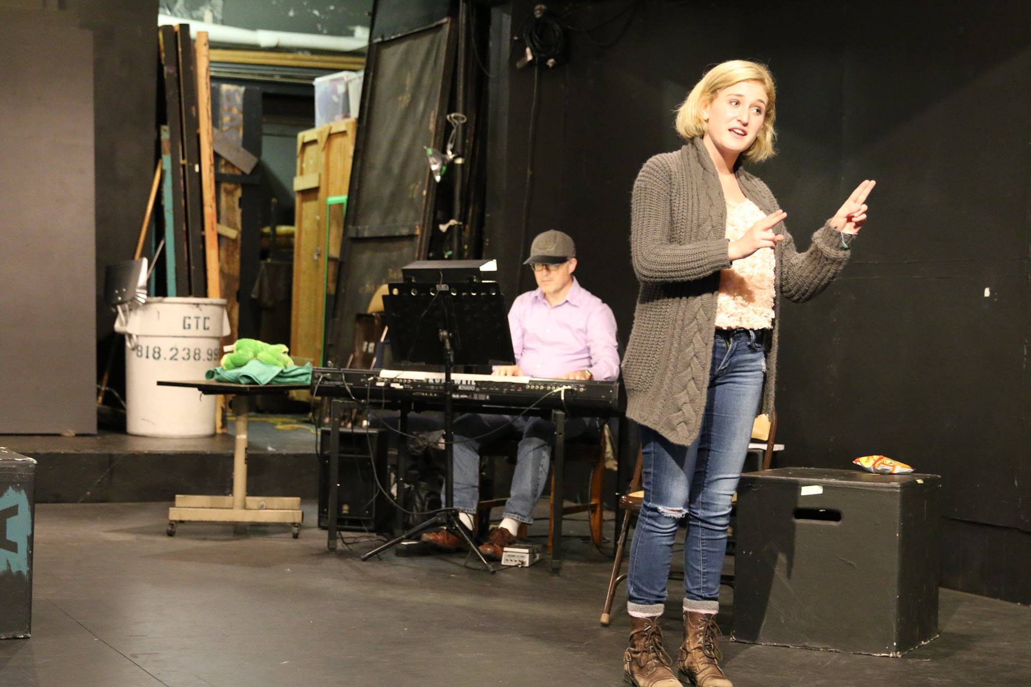 This song was really fun to create. I hate these rules they teach in musical theater writing workshops, you know, that the second song should always be an “I want” song, as in what the character wants. Sometimes that’s fine and sometimes who cares? But I thought it would be fun to actually have a song called I Want, about everything this character wants in her life. To do it, I simply asked Sami to make me a list of everything she really wants. A day later I got this huge list of things. I removed some stuff right away that I knew wouldn’t work, and then I sat at the piano, trying to organize it and figure out how to extract lines, make them rhyme, be musical and have form. And nothing I did was working. At all. So, I went away, then came back and just stared at this pared down list. And then I just set it to music, finessing lines when needed and making the rhymes, and it was just one of those magic moments when something just happens and it’s right. Have I already told this story? It sounds familiar. Well, if I have just chalk it up to my ever-present senility. Here’s a photo of Sami doing a number about boys, in which she’s telling boys how they should behave with her – and signing the whole song – it’s really sweet and cute and Sami’s a great signer. That’s musical director Alby Potts in the background.