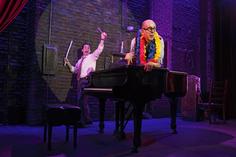 Joe Kinosian and Kellen Blair have crafted a madcap musical murder mystery comedy for two extremely talented performers to enact for 95 frantic minutes. Their Murder for Two is currently on the stage of the intimate Audrey Skirball Kenis Theater at the Geffen Playhouse. The show premiered at the Chicago Shakespeare Theater and, though it won the Chicago critics’ award for Best New Musical Work I find it difficult to classify it as a musical. Kinosian provided the music for Blair’s lyrics but the songs are often more recitative than full out musical theatre songs. Plus they are instantly forgettable. The show is a wild farce—part British Music Hall revue, part commedia dell’arte, part twisted Agatha Christie with a soupcon of naughty Mel Brooks’ humor. The constant breaking of the fourth wall becomes an annoyance and though director Scott Schwartz’s pacing never flags, it does become a bit wearying, not only for the actors who are drenched in sweat before the halfway mark, but also for the audience. It is chock-a-block with laughs and sight gags and provides a great evening’s entertainment.