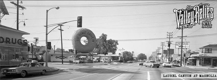 I can’t imagine this building being a Kelbo’s but you never know. Then again, whatever building Kelbo’s may have had certainly could have been torn down. Then I looked up online the Tarzana address where my father’s restaurant was, the Valley version of the Kiru, which opened in August of 1964. I don’t believe any of us kids ever went there, and it was only recently that I discovered that they hosted the opening night parties for Valley Music Theater – a theater-in-the-round that I went to, for heaven’s sake. There was something clearly wrong with my father to not let me know that or invite me, but that was my family. So, I found a street view of the address as it is now – it’s one of those large, modern quarter-block long malls now. Before we get off this subject, when I moved to North Hollywood in 1978, it was still a rather quaint little neighborhood. I especially loved the corner of Magnolia and Laurel Canyon, because there was one of those funkly LA marvels, a donut shop with a huge donut sculpture on top. Across from that was our local drugstore. Well, they tore down that iconic donut shop and replaced it with a bank and a strip mall. Here was what it looked like when I lived there – who would allow a building like that to be torn down. Shame on them.