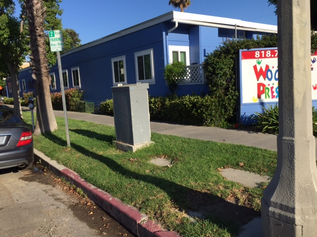 Then I came home, did some work on the computer, had some telephonic calls, and listened to some music. Because of all the nostalgic restaurant notes of the last few days, I’d discovered something very intriguing on Google – a matchbook from my beloved Kelbo’s. Now, the only Kelbo’s I ever knew about were the one we always went to, on Pico (the original, despite some idiot saying the other one was the original), and the other one on Fairfax across from CBS. But this matchbook rather astonishingly listed the addresses of THREE other locations – one in Brentwood, at the corner of San Vicente and 26th Street, one in Manchester on Manchester Blvd., but most astonishingly, one right here in the Oaks of Sherman. I couldn’t believe it. I have no idea what era that matchbook is from, but I’m guessing if there was a Kelbo’s out here it would have been in the late 1950s/early 1960s but probably gone by the mid-1960s. So, since I had the address, I drove down there – it was located a block east of Woodman, on the southeast corner. It’s a pre-school now, and apparently has been for a while. I took a photograph.