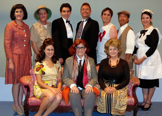 Elizabeth Bouton’s Miss Tweed could use a touch more Miss Marple in her characterization—she comes off more as a brandy imbibing snoop than sleuth. Megan Duquette as Hope has a lovely soprano and she wears her 1960’s fashions (costumes by Kathy Dershimer) quite well. Roy T. Okida seems to be enjoying himself as Flint, the handyman whose fingers can’t resist a feminine derriere. Aaron Eberhardt makes an ardent but mysterious suitor for Hope. Unfortunately the tech was a bit off—a botched electrocution here, a misplaced flying shoe there–but hopefully the crew will soon be in sync with the cast and the result will be a merry mystery romp through Agatha Christie Land.