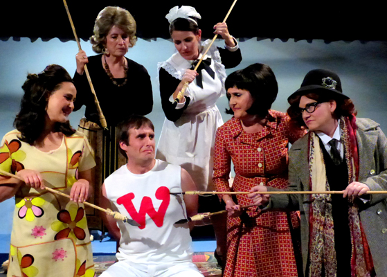 Catherine Rahm’s direction could be tighter and her plucky cast could use a bit more energy and comic flair but that may come with more performances under their belt. Opening night was unsteady at times but they still generated laughs from the capacity audience. Alison Mattiza’s choreography was fairly simple and by rote but “Carry On” was a fun number for the ladies who ended up in a kick line with pygmy spears instead of the usual canes.