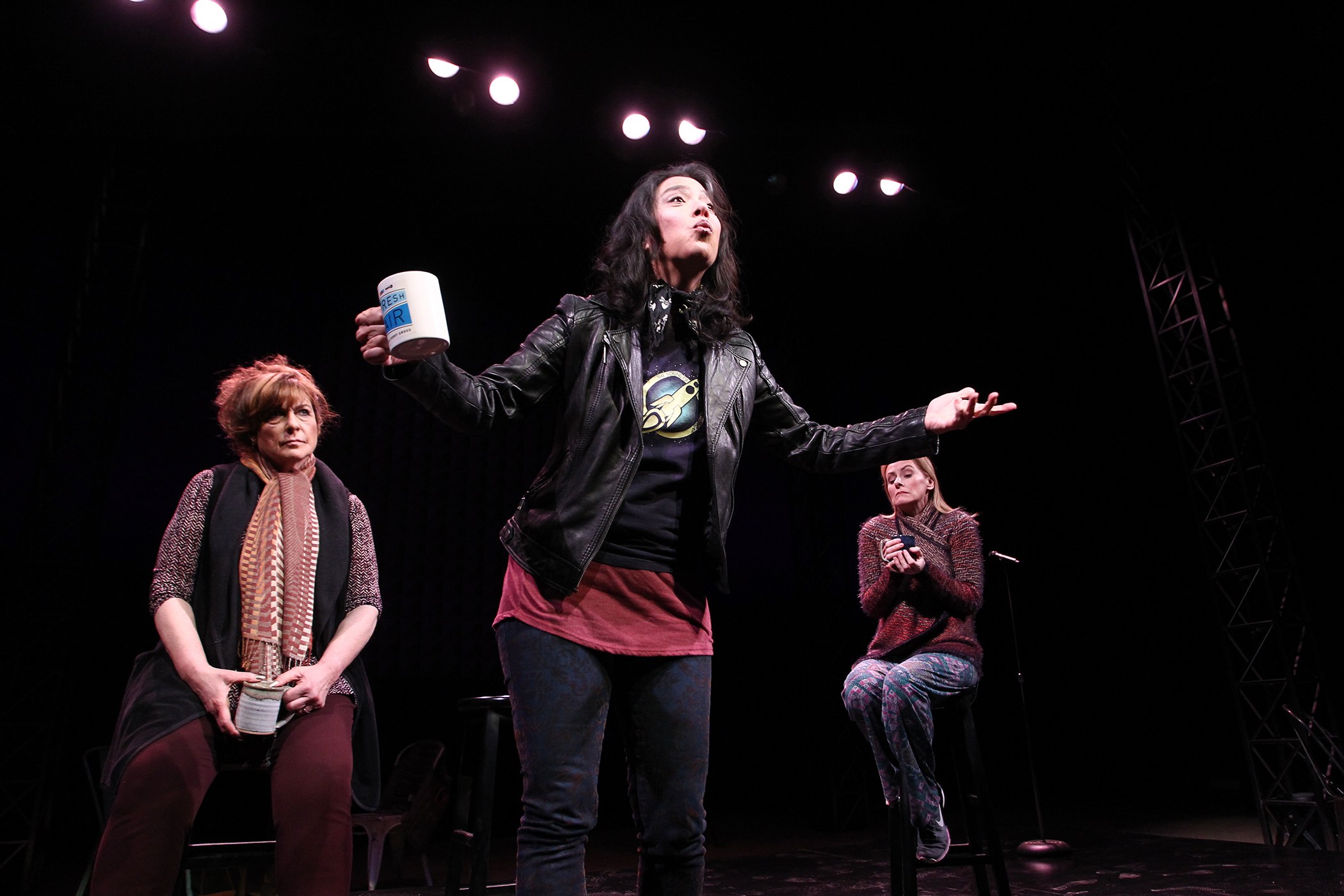 The show reads and plays very much like most of Loh’s solo works—this time she examines women of a certain age and menopause. Her pithy and spot-on observations of the Southern California lifestyle elicit many knowing laughs from the audience. Everything from yoga and kale to Burning Man and marriage counselors get taken to task. Loh’s writing is very humorous as well as heartfelt and even touching at times. Midlife crises and extra-marital affairs, depression and parent/child relationships as well as the various effects and remedies for menopause all get examined in the concise, compact 90-minute intermission-less piece.