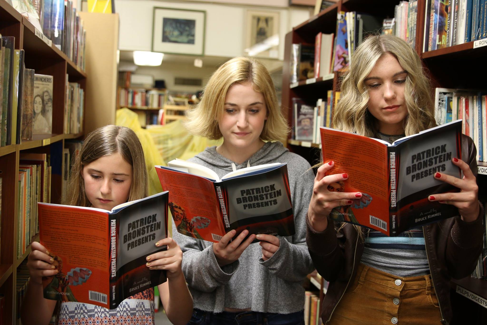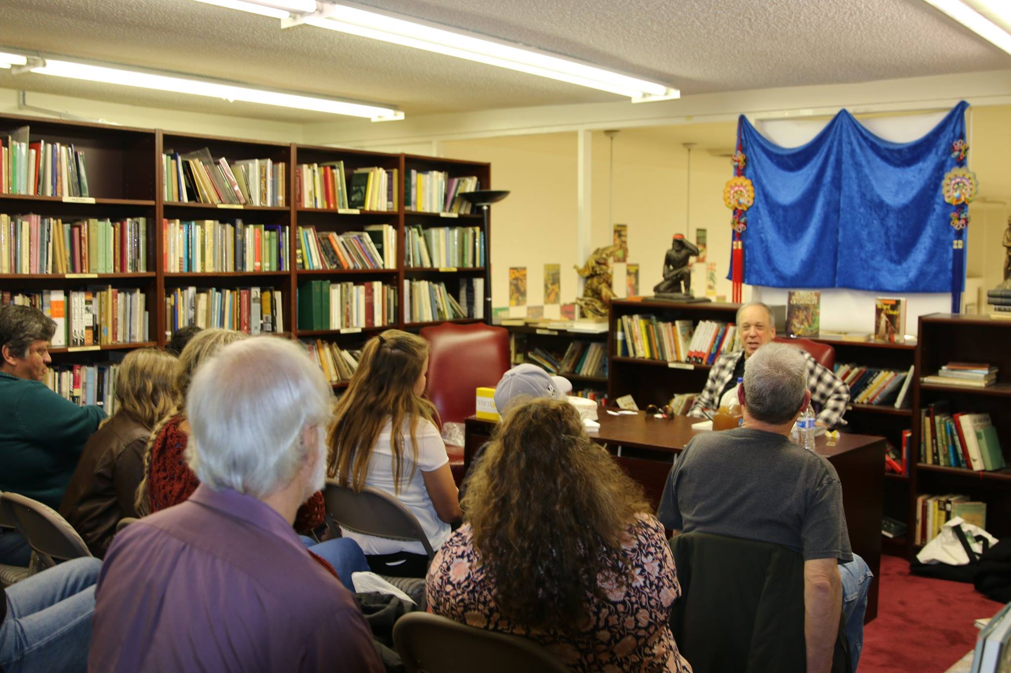 Once there, we got everything set up and people began arriving. Despite all the cancelations, we ended up with a great crowd. In attendance, dear reader Mark (sans dear reader Amy), Doug Haverty, Adryan Russ, Sami and her mom, Brennley Brown and her mom, Hadley Miller and her mom and dad, Henry Stanny, Marshall Harvey, a fellow named John Christopher who I’ve known for almost forty years, friend Joanna Erdos, friend Karen Cohen, and several people who were not known to me, which I always enjoy. I began by reading the preface and chapter one and there were lots of laughs and I had a great time. Then I skipped ahead to the making of Bronstein’s first film, The Strange Terror, and they were all laughing merrily away. Then I answered questions, which I love doing. I signed, then we ate cake (I didn’t have any), and then I was asked if I could stay an extra fifteen minutes to speak to a writing class that meets at the store, taught by the excellent writer Dennis Etchison. Of course I said yes. That was almost as much fun as the reading. I don’t really ever consider myself worthy of talking to other writers – I’m just a guy who writes, like it or hate it. But Dennis asked great questions and I think whenever you hear the process of a writer it’s always interesting, even if that process wouldn’t work for you. I do have several tricks I use that insure I never get writer’s block and I shared those and that was very interesting to people, as was my use of Muse Margaret. I had a great time. Here are some photographs. First, the crowd with me reading. As always, I look like an idiot.