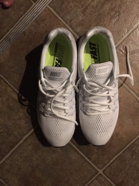 When I came home I Googled the running shoe I’d bought – it is one of the most popular running shoes there is – and I read several reviews of said shoe and guess what they all said – they all said the shoe runs small, i.e. you’ll need to go up a half size, which is, I assume, also the case with the chocolate brown shoe. So now I have me three pairs of new shoes on my size 10 feet that did not grow – thank goodness that mystery has been solved because for it to remain unsolved would be heinous. Here are some actual photographs of my three new pairs of shoes – did you know that if you rearranged the word pairs you get Paris? Just asking. First up, the new and very popular running shoes.