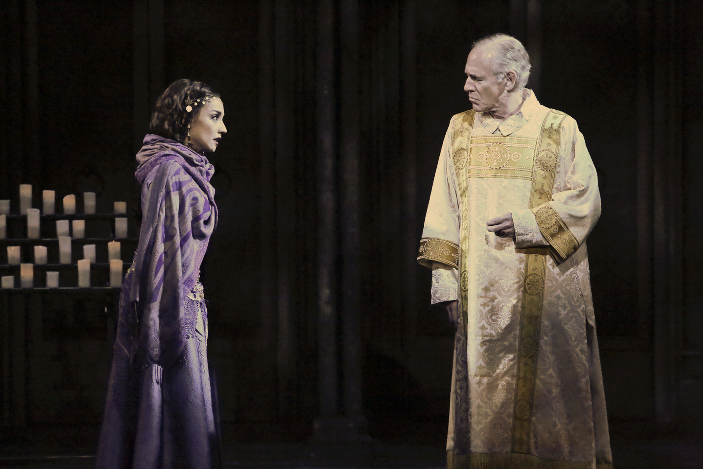 McCoy Rigby Entertainment is presenting the L.A. area premiere at the La Mirada Theatre and it is a stunning piece of theatre, sure to be one of the year’s best. Parnell gives us a lot of back story on the show’s villain, Dom Claude Frollo (the dominating Mark Jacoby), Bishop of Notre Dame Cathedral, giving reasons for his deep religious faith and his fanatical hatred and persecution of gypsies. Parnell has also taken the comic elements out of the gargoyle characters, making them voices in Quasimodo’s head, voices that encourage him.