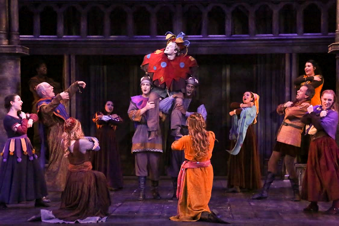 The tech is all of the highest quality—Stephen Gifford’s imposing bells along with cathedral windows and arches, Marcy Froehlich’s colorful costumes, Jared A. Sayeg’s masterful lighting design, dark when needed, bursting with color when called for, Josh Bessom’s sterling sound design (not a word or a note missed). Dennis Castellano’s music direction makes this score, music by Alan Menken, lyrics by Stephen Schwartz, soar heavenward. The best songs are still those from the film, the others fill out the plot. The 30-plus on stage choir, under the management of Sean Gabel, gives the score a big, lush choral sound that is just thrilling to the ear. Dana Solimando has added some fun and lively choreography for the gypsies. May the bells toll forever for The Hunchback of Notre Dame but you have a limited time to see it for yourself.