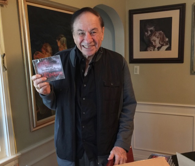 Well, dear readers, first things first – Richard Sherman came by yesterday to get some copies of Unsung Sherman Brothers. It was such a treat to hand it to him – these three unrealized projects broke the brothers’ hearts back then, so to finally have this material out in the world for folks to hear has made him and me very happy. To hold a finished CD in his hands less than four weeks after I first proposed the idea to him is actually mind-boggling. So, here he is, holding the CD.