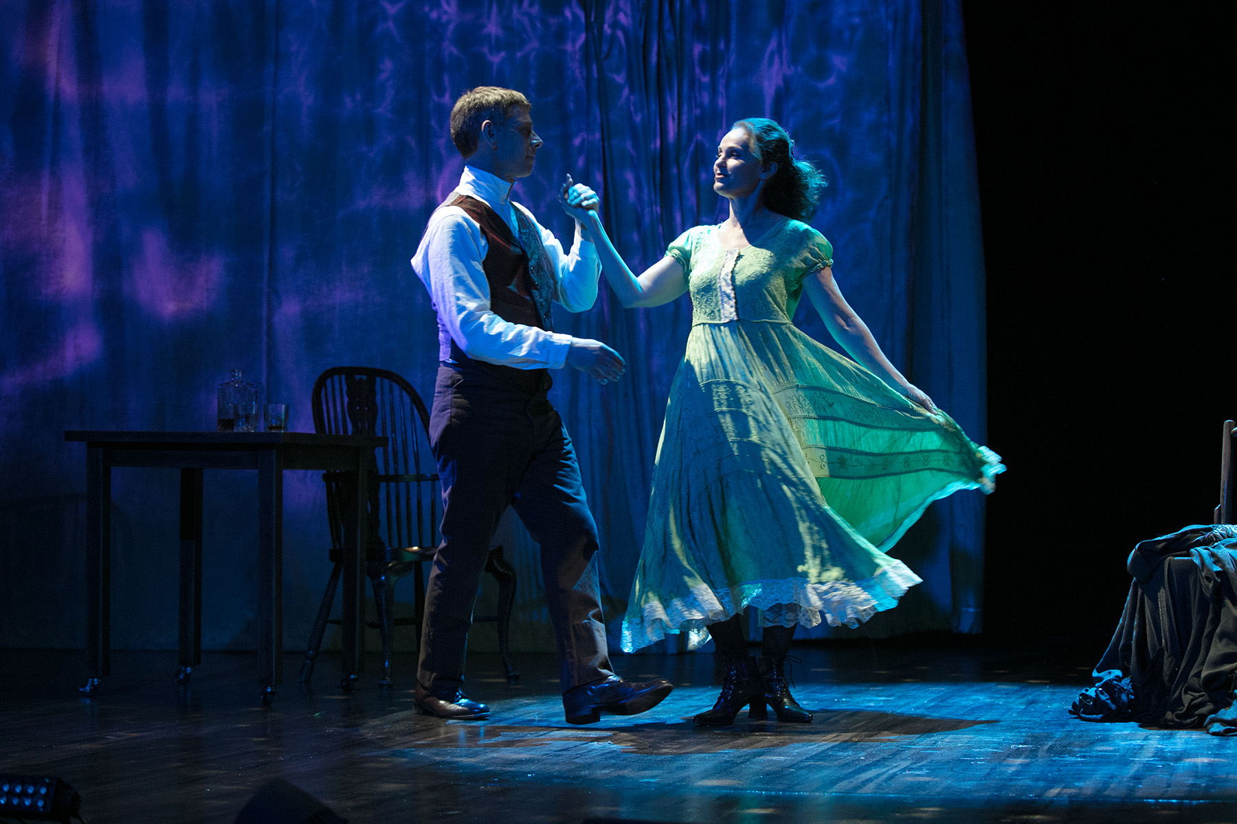 The Narrator (Ron Bottitta) recites various rules to set up scenes in this fast moving, well directed production helmed by Jo Bonney. Walter Brown (Jamie Harris) is a very successful businessman whose latest transaction is to purchase the failing business of the Leeds family. The patriarch is dead, the youngest son has been banished and mother Martha (Amy Brenneman) and eldest son Nathanial (Matthew Elkins) have been reduced to near poverty, selling off their pigs while forced to eat their horse. Brown isn’t just increasing his business holdings he is settling an imagined slight and long held grudge against Martha. It seems he was taken with her wild beauty at a wedding party when he was 17 and she was even younger. She dismissed his request for a dance and his life spiraled downward on that fateful day. But it also motivated him to become a success and exact his revenge. Martha claims to have no memory of the occasion. To complete the signing of the business deal, Brown expects a handshake from Nathaniel, but Nathaniel has a phobia about being touched and in his nervousness spills a cup of tea on Brown’s expensive boots. A challenge to a duel is extended and the plot thickens.