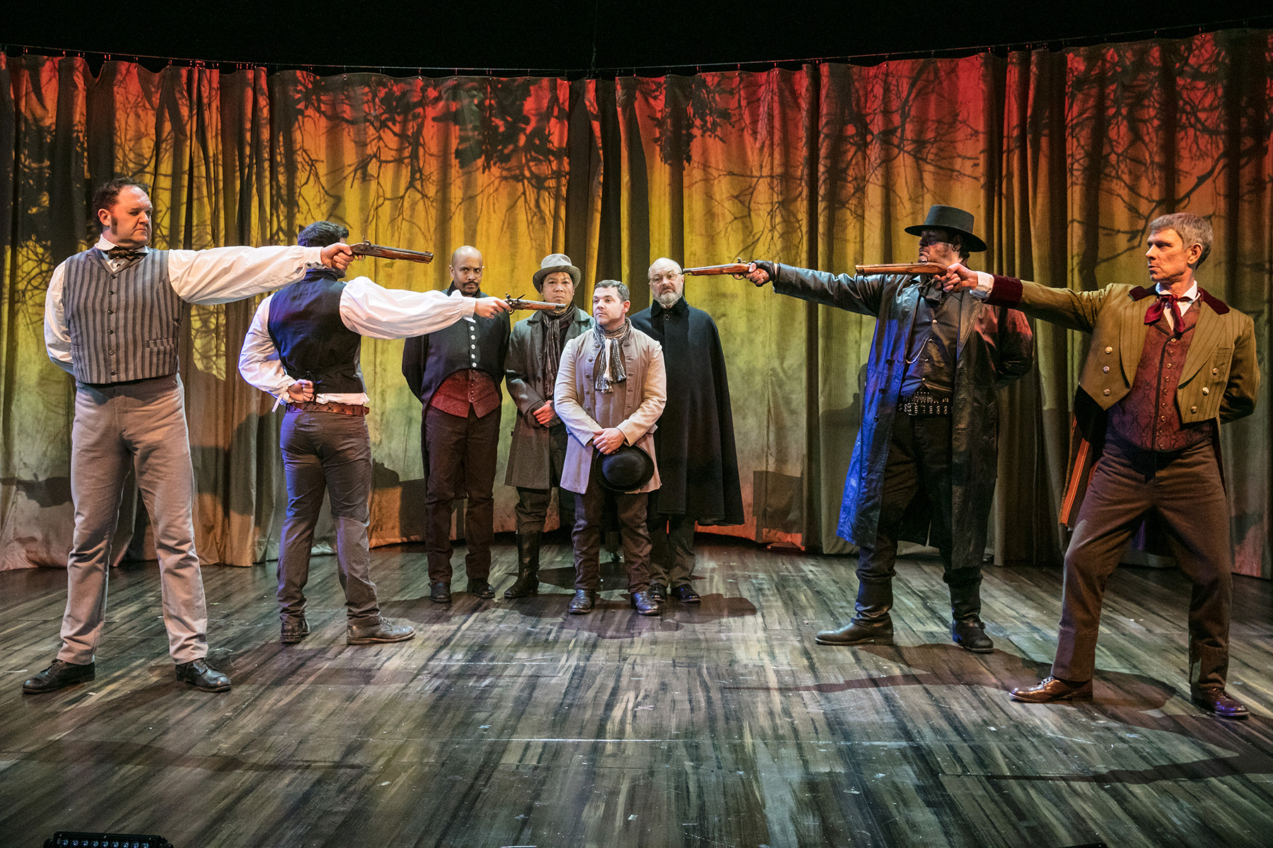Nathaniel has always been sheltered by his mother and seeks out assistance from his younger brother James (Josh Helman), who he finds in a bar conducting a duel with a Chinaman (Feodor Chin) over the death of a blue heron. Nathaniel shames his brother into aiding him and, after a rocky reunion with his mother, James tries to negotiate a bloodless settlement of the duel. But Brown is mean and vicious and determined to maintain his reputation as a master duelist. Martha then tries to use her feminine charms on Brown, counting on him to still be fascinated by her. Brown leads her on until he destroys her honor and she now wants revenge on him. There seems to be no recourse except to complete the duel. The climax ends with the stage resembling as abattoir, the result of a double duel, involving the Seconds as well as the Principals, on the field of honor.