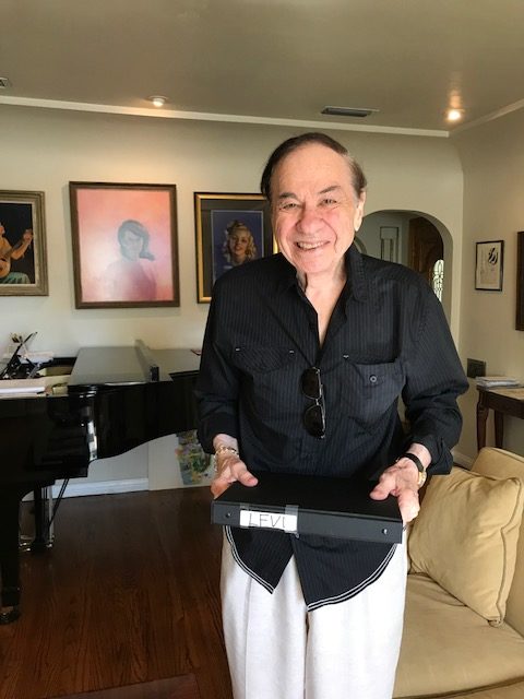 Prior to rehearsal, I’d gotten about seven hours of sleep (the iPad alarm app actually worked). Once up, I answered e-mails and did some work on the computer, then I toddled over to Hugo’s and had my beloved small Caesar salad and pasta papa, both excellent. After that I came back home. I listened to music for a bit, and then had a nice and long visit with Richard Sherman, just chatting about the musical and how much he likes my revision of same. We’re both looking forward to the July reading and, more importantly, to the full production. Here’s an actual photograph of the actual Richard Sherman standing in my actual living room, holding the script for the musical. Since you can see the title on the spine of his notebook, I may as well tell you that the musical is entitled Levi – and is the story of Levi Strauss – an immigrant who came to the United States and was the epitome of finding the American dream.