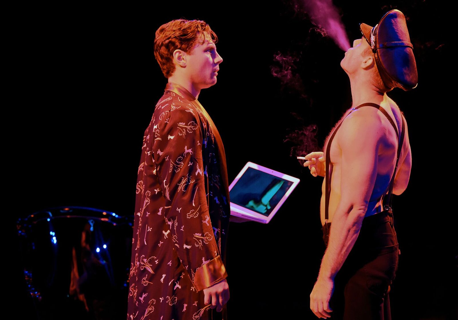 In the 1958 scenes, Oliver is a novelist, mostly of children’s books. Sylvia, a former actress, is his newest illustrator. They’ve been working for a while and Sylvia has finally invited Oliver to dinner to meet her husband Philip, who is in the real estate business. Sylvia is dealing with the aftereffects of a miscarriage and the coolness of her husband. The two men seem to be opposites at first but we soon learn they are involved in a torrid homosexual affair. Oliver is in love but Philip tries to overcome his perversion and finally breaks with Oliver after savagely raping him. The final scene of this era has Philip submitting to primitive aversion therapy at a private clinic. The feel of these scenes is very much of a Terrence Rattigan/Harold Pinter type of play. The characters keep their emotions very controlled for the most part, afraid to break society’s rules. In 2008, Philip has just broken up with Oliver for the third time in their year and a half relationship. This time it’s serious because he’s taken his books. Oliver loves Philip but he also has an addiction to public sex. He just can’t stop himself from servicing men he encounters in parks. Oliver seems suicidal this time and his best friend Sylvia tries to cheer him up, while fending off the advances of her amorous Italian lover. Sylvia seems to forge a reconciliation by bringing the couple together for the Pride celebration. The acting is stellar with Prew having the biggest range in his characters. Bledsoe is very tightly buttoned up as both Philips yet he does expose some humanity and warmth. Collins effortlessly plays the frustrated wife/career woman as well as the liberated free spirit. Matthew Wilkas provides great support in a variety of roles from a role play escort to a homophobic doctor. At times The Pride is not an easy play to view but thanks to Arden’s unrelenting direction and the talent of his cast, it demands and keeps your attention.