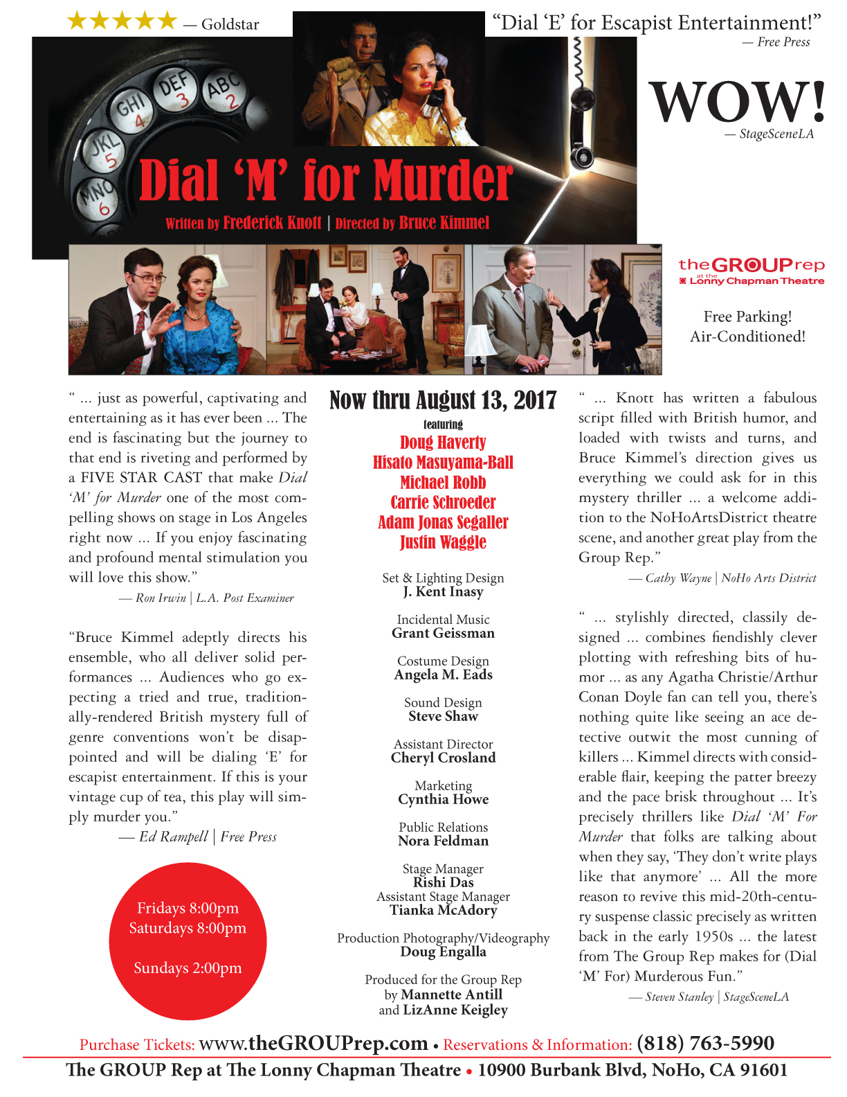 Today, I will not be sleeping until one, that much I can tell you. I have to pick up all my dry cleaning from the cleaners, I have to eat, I’ll hopefully pick up some packages, I’ll Xerox Levi scripts, and I have to have a Levi work session with the musical director of the show. Then I’ll be seeing the evening performance of Dial ‘M’ for Murder. Here is our little flyer with review quotes – we’re still waiting on a few reviews and if they’re good we’ll add them to these.