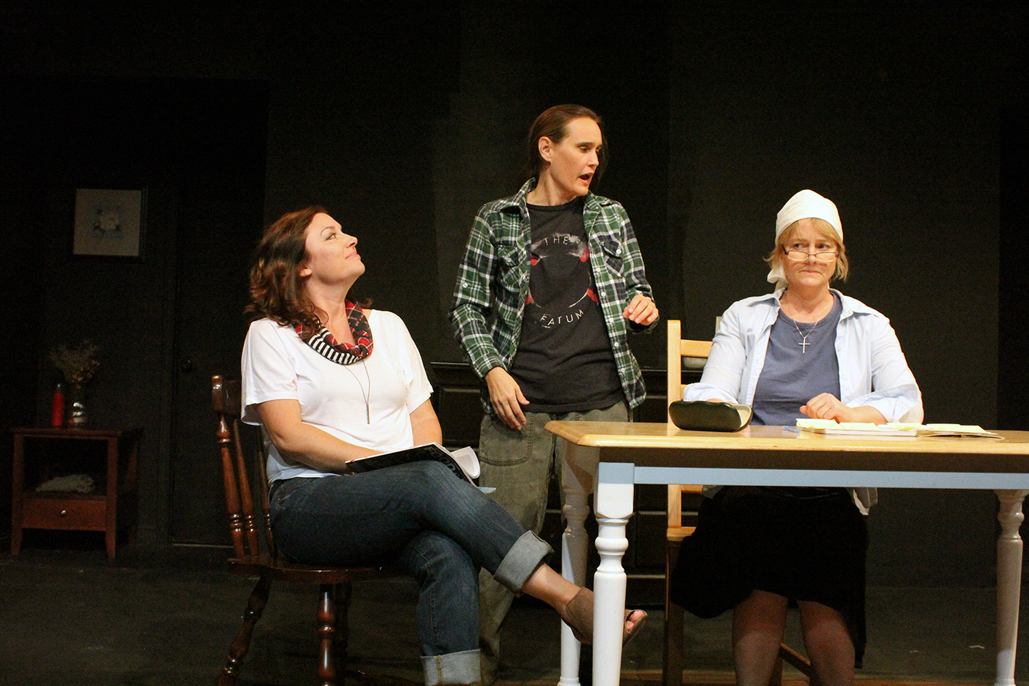 There are dysfunctional families north of the U.S. border as depicted in Canadian playwright Daniel MacIvor’s Marion Bridge, currently receiving its West Coast Premiere at Sons of Semele Theater. The action takes place in the MacKeigan family home on the island of Cape Breton off the coast of Nova Scotia. The three MacKeigan sisters have reunited to keep a death watch on their soon to expire mother. Agnes (Amy DeBourget) is a struggling actress in Toronto with maxed out credit cards and unresolved issues with her mother. Agnes had a teenage pregnancy and was sent away to a convent to have the baby which was then adopted. On her return to Cape Breton, she finds out her now rebellious teenage daughter is unhappy with her adopted family. Agnes intends to befriend her. Theresa (Carolyn Reese Crotty) is a nun whose order runs a farm and where Theresa says she is very happy. She may be losing her faith. Louise (Sarah Boughton), the youngest daughter is very mannish and considered strange. She loves trucks and is fixated on a TV soap opera where she feels she can identify more with the outrageous characters than the real people in her life. The sisters slowly discover each other’s secrets and reconnect their frayed familial bonds. The trio of actresses gives strong performances under Don Boughton’s direction. MacIvor has written a detailed and revealing monologues for all three which are the highlights of the production.